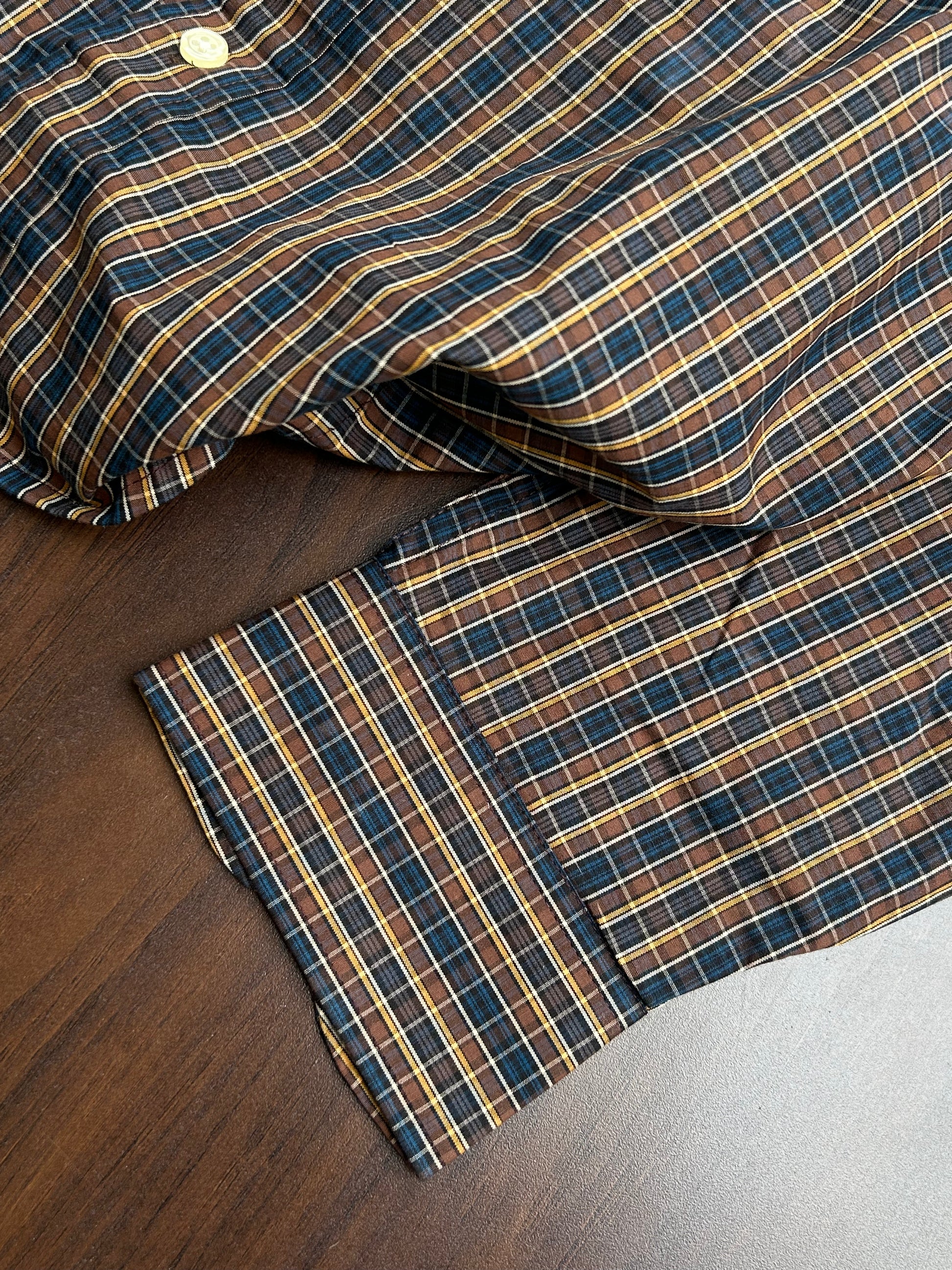 Bring sophistication and edge to your wardrobe with the Bradbird Midnight Rust Checks Shirt. Featuring a rich navy base with fine rust-orange and white checks, this shirt offers a bold, masculine look that transitions seamlessly from day to night. Made with premium RFD cotton for unmatched comfort and breathability, it features a button-down collar, signature Bradbird branding on the chest, and precision stitching throughout. Whether paired with black denim or chinos, this shirt is made for those who dress with intent and attitude.