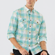 Ek fresh aur cool look ke liye ye mint green aur seafoam plaid shirt perfect choice hai. Isme white aur soft yellow lines ka ek clean pattern hai jo summer aur spring season ke liye ekdum fit baithta hai. Signature Western yoke design aur double utility flap pockets ise ek rugged edge dete hain, jo premium fashion aur functionality ka sahi balance hai.
